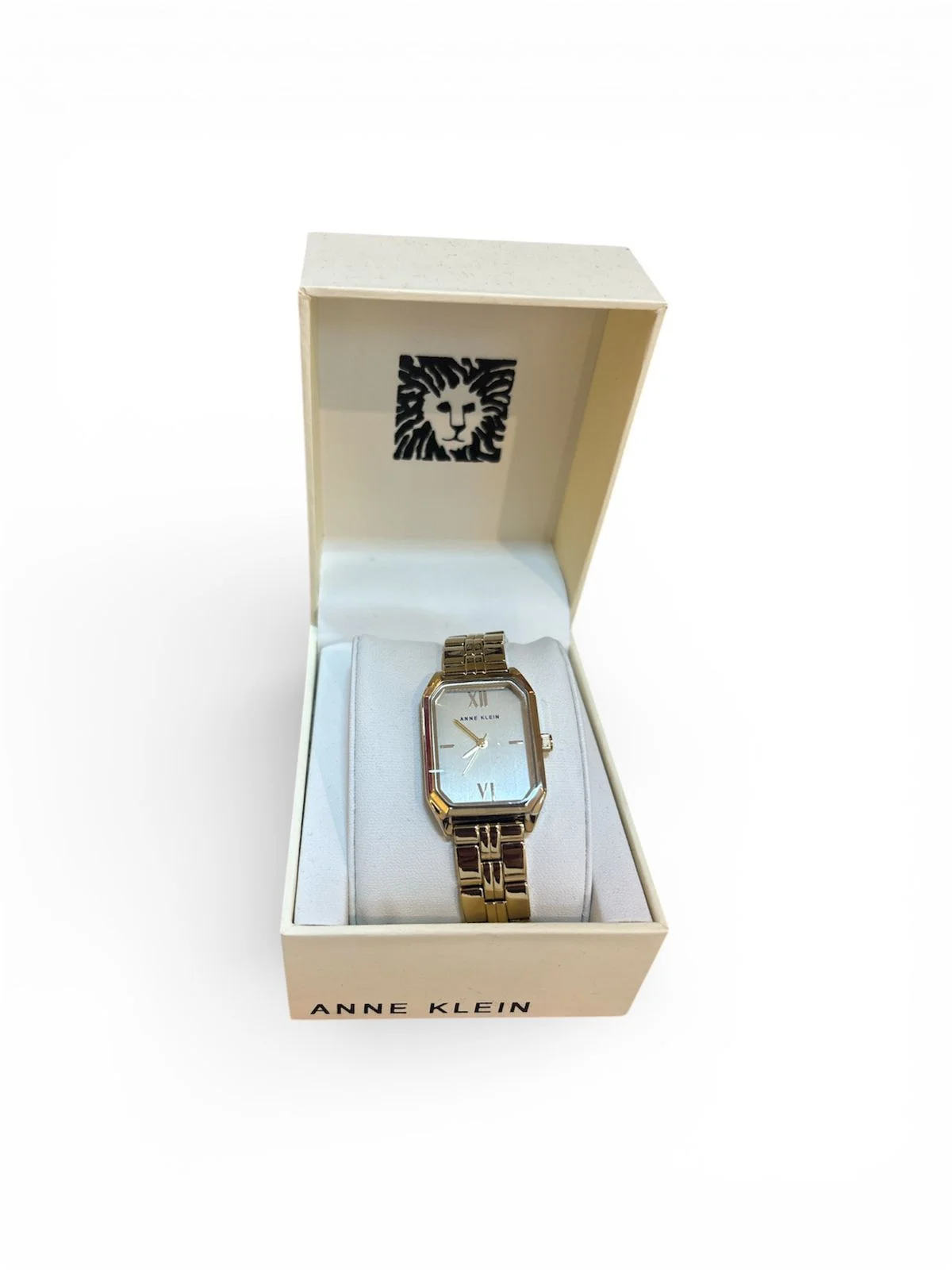 Reloj Anne Klein para dama con esfera blanca rectangular, caja y brazalete totalmente dorado, presentado en estuche de regalo de la marca.