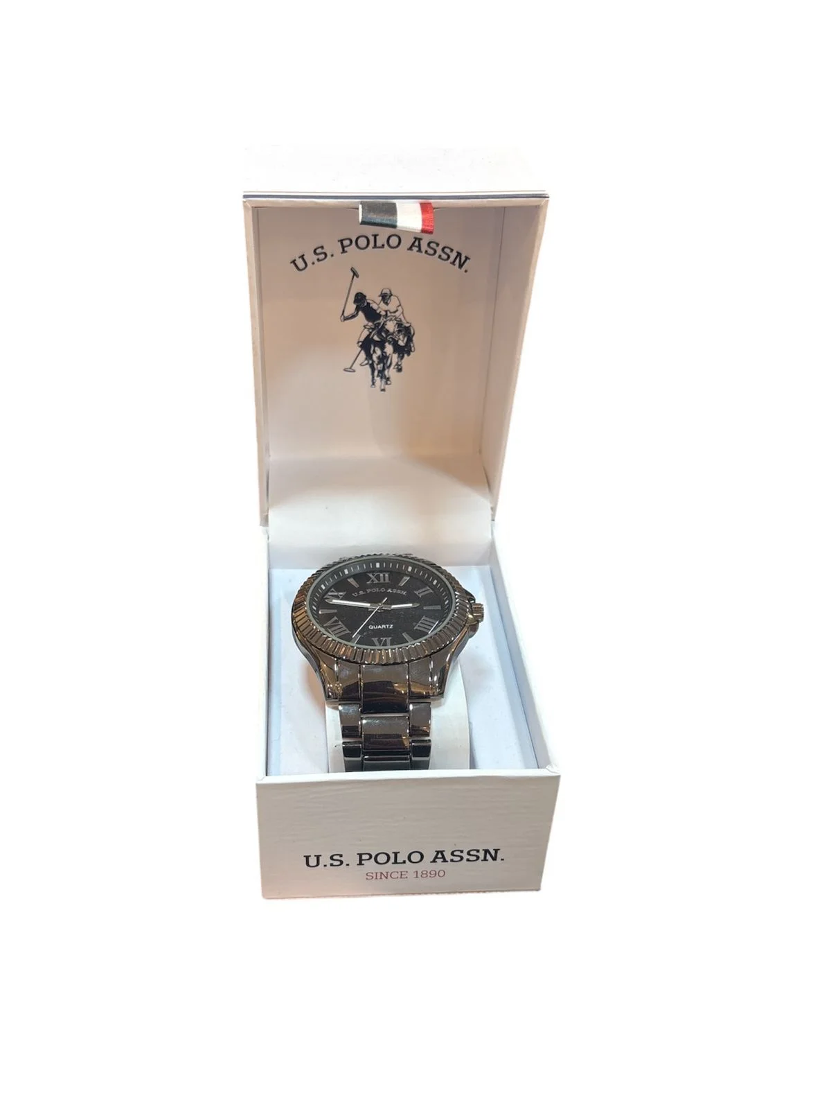 Reloj U.S. Polo Assn. para caballero con esfera y caja en tono negro/grafito, brazalete metálico oscuro, presentado en estuche de regalo de la marca.