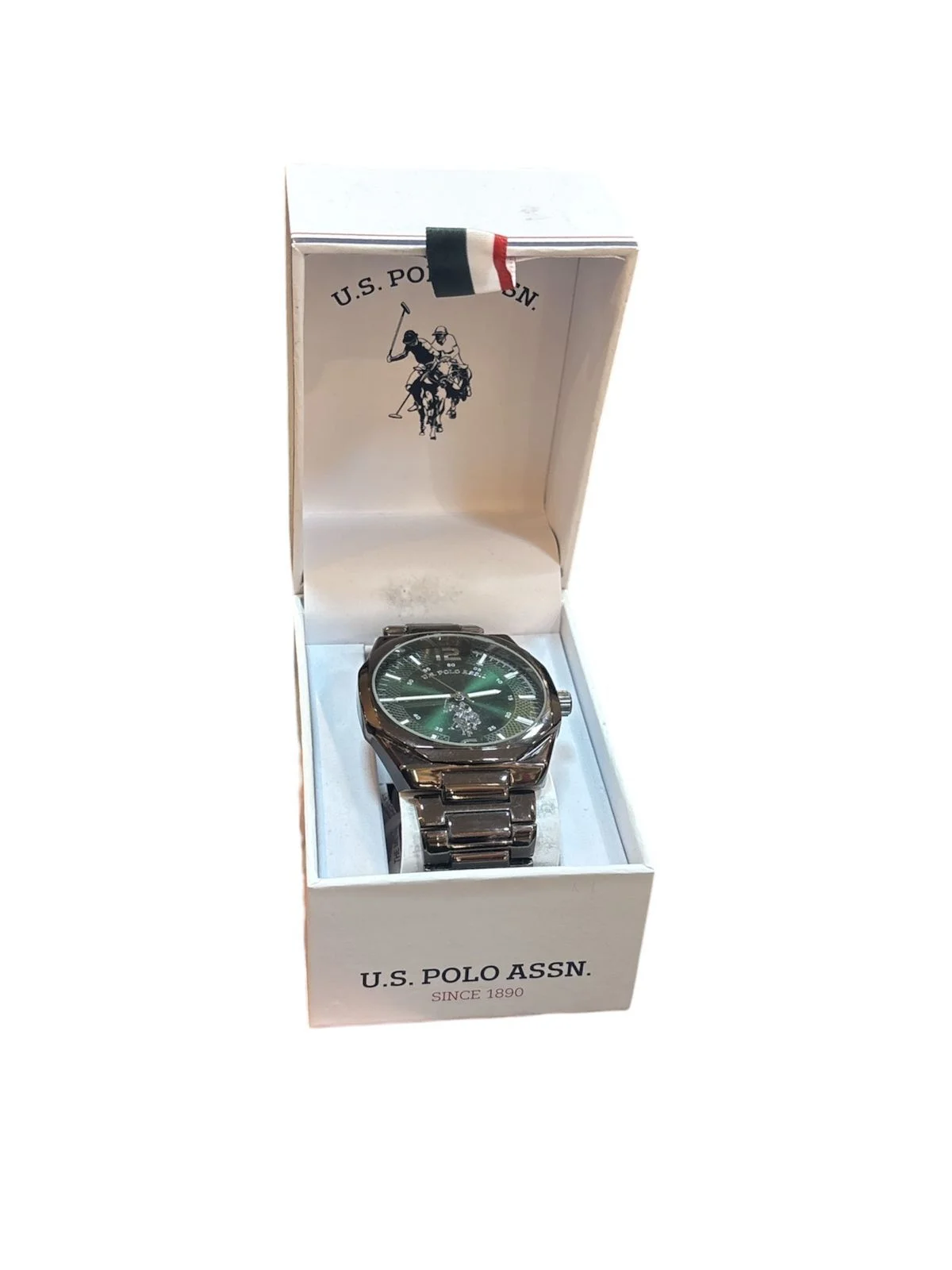 Reloj U.S. Polo Assn. para caballero con esfera verde, caja y brazalete metálico en tono plateado/acero, presentado en estuche de regalo de la marca.